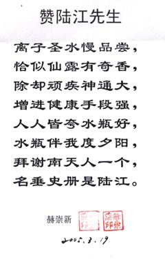 凡尊重中國古代養生智慧的患者,堅持“已饑方食”和定時主動補水者,均可祛病康復。如牡丹江醫學院87歲的張鵬圖飲用半年后高血壓未痊愈,陸江與他通話交流,了解他原先每日主食4兩,建議他用“已饑方食”減少主食肉食量,他理解后,將每日主食減為3兩,少吃兩塊肉,飲用一年治愈26年的冠心病和高血壓。他2003年5月31日來信說:“飲用卓康小分子團水是根治高血壓、冠心病、糖尿病的一把金鑰匙,是填補醫學空白,為人類造福,應推廣該產品。”